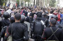 Students of Cairo University, who are supporters of the Muslim Brotherhood and ousted Egyptian President Mohamed Mursi, shout slogans against the military and interior ministry during a demonstration in front of riot police. PHOTO BY REUTERS